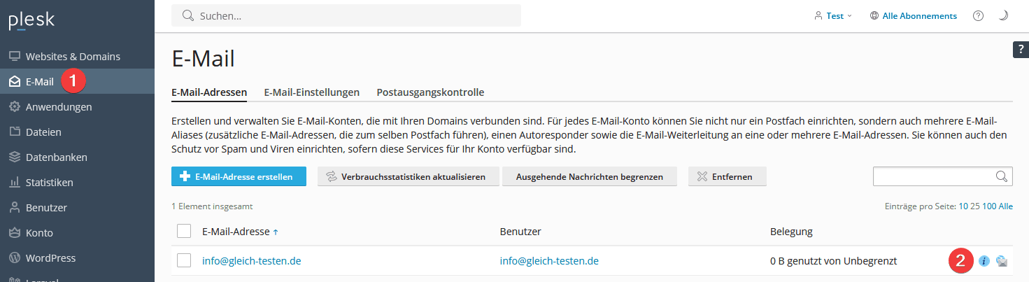 Loggen Sie sich in das Plesk Interface ein, klicken Sie auf „E-Mail“ (1) und anschließend bei dem gewünschten E-Mail Konto hinten auf das i (2):