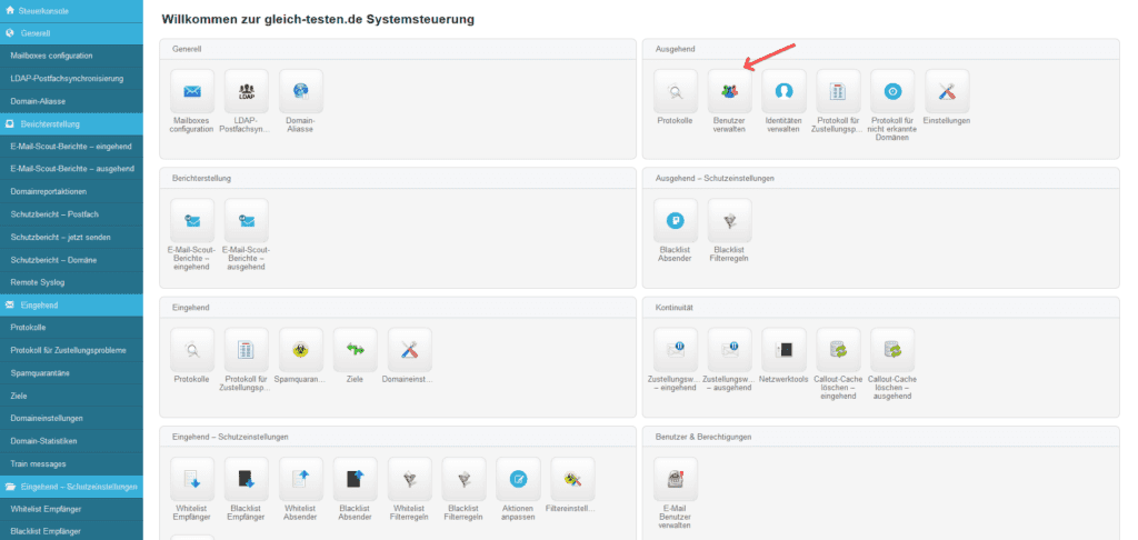 Loggen Sie sich für die weitergehende Einrichtung in das SpamExperts Interface ein und klicken Sie unter “Ausgehend” auf “Benutzer verwalten”:
