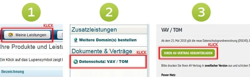 - Auf der linken Seite finden Sie unter dem Punkt “Dokumente & Verträge” den Unterpunkt “Datenschutz: VAV / TOM”.