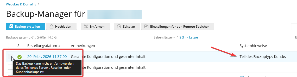 „Das Backup kann nicht entfernt werden, da es Teil eines Server-, Reseller- oder Kundenbackups ist.“