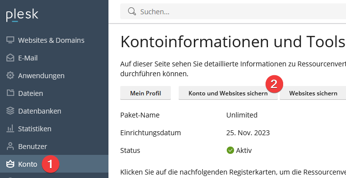 Wechseln Sie in Plesk in den Bereich Konto (1) > Konto und Websites (2) sichern.