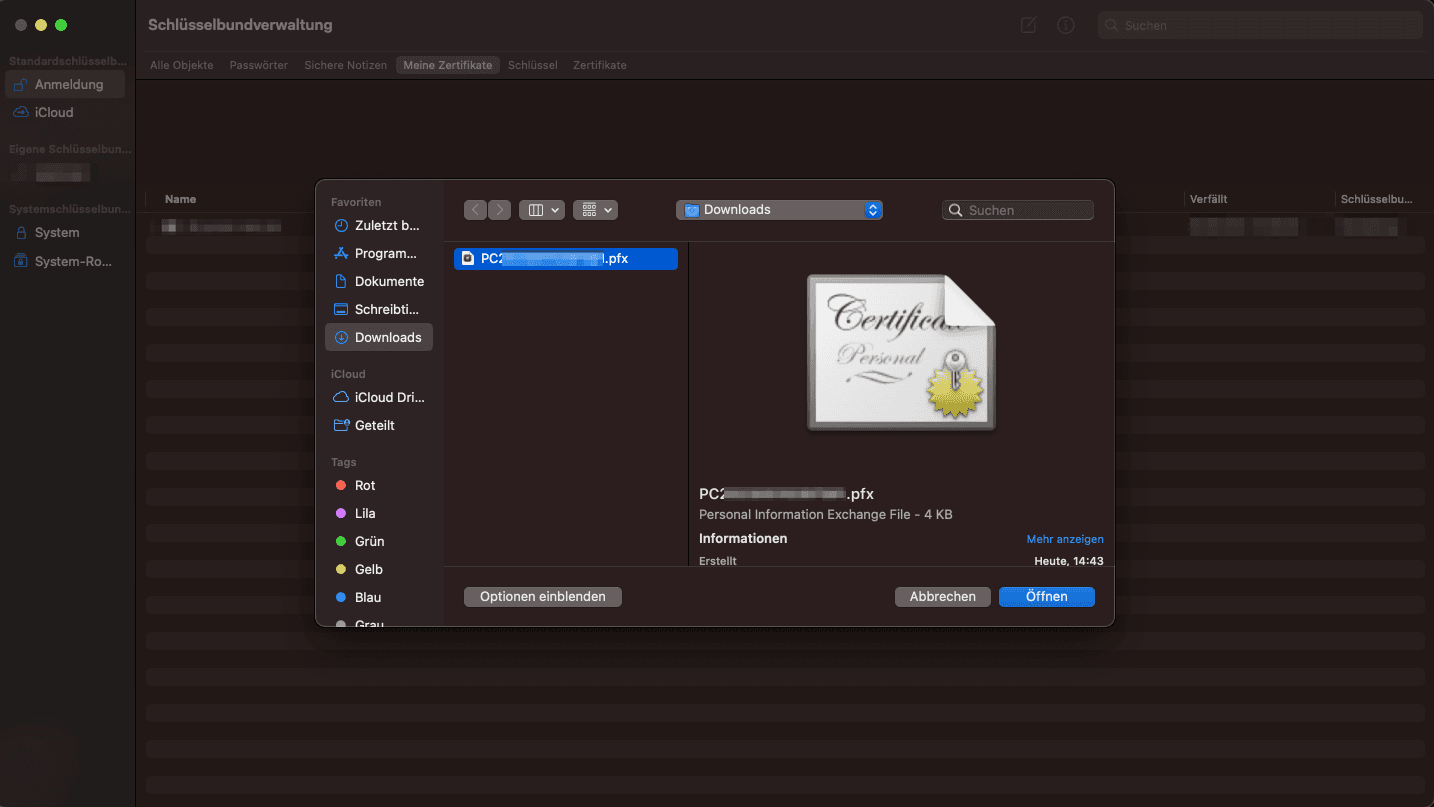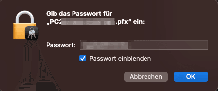 4. Wählen Sie nun die Zertifikatsdatei (z.B. PC20123456789.pfx) aus, die Sie auf Ihrem Mac gespeichert haben. Bestätigen Sie diese mit dem Button “Öffnen”. Geben Sie nun Ihr Zertifikatspasswort im Feld “Kennwort” ein, welches Sie im Rahmen der Zertifikatsbestellung festgelegt haben. Klicken Sie auf den Button “Ok”.