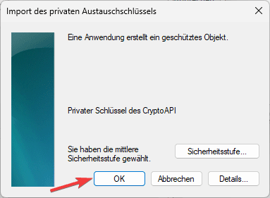 6. In dem Fenster “Import des privaten Austauschschlüssels” klicken Sie auf den Button “OK”.