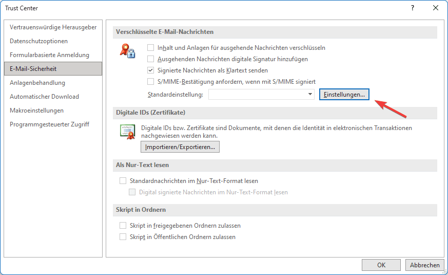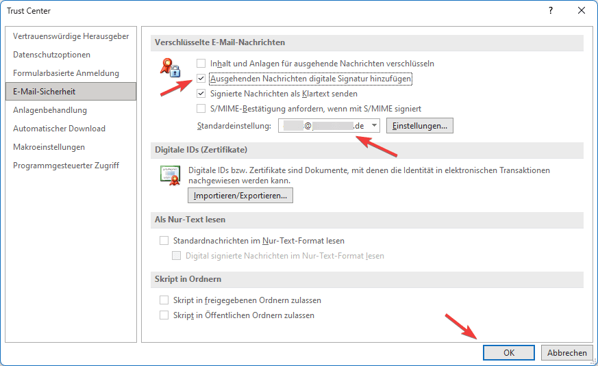 11. Setzen Sie einen Haken bei “Ausgehenden Nachrichten digitale Signatur hinzufügen und wählen Sie bei “Standardeinstellung” Ihre Einstellungen aus.