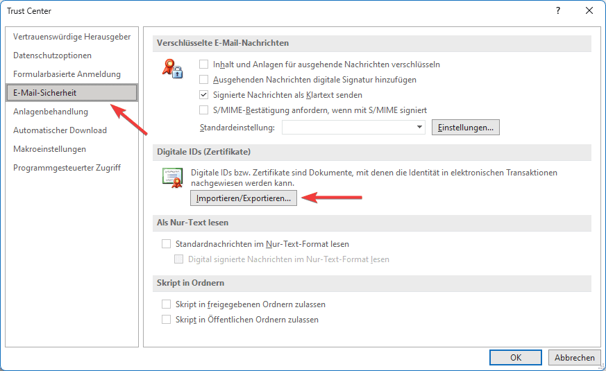 4. Wählen Sie nun den Menüpunkt “E-Mail-Sicherheit” aus. Klicken Sie anschließend auf den Button “Importieren/Exportieren…”.