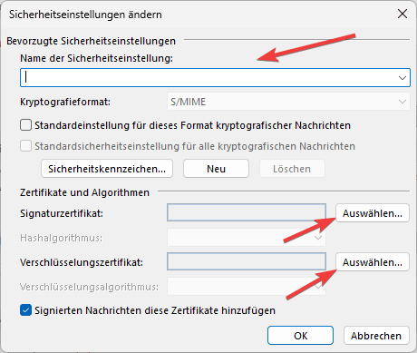 8. Tragen Sie im Feld “Name der Sicherheitseinstellungen” z.B. Ihre E-Mail Adresse ein. Anschließend klicken Sie bei Signaturzertifikat auf dem Button “Auswählen…”. Das Verschlüsselungszertifikat wird in der Regel automatisch analog mit dem Signaturzertifikat ausgefüllt. Sofern dies nicht der Fall ist, wählen Sie dies ebenfalls aus.
