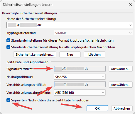 10. Nun sollte das Signatur- und Verschlüsselungszertifikat auswählt sein. Prüfen Sie, ob der Haken bei “Signierten Nachrichten diese Zertifikate hinzufügen” aktiviert ist. Klicken Sie anschließend auf “OK”.