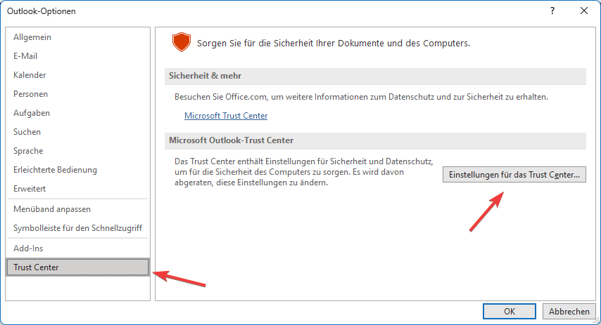 3. Klicken Sie nun auf “Trust Center” und dann auf den Button “Einstellungen für das Trust Center…”.