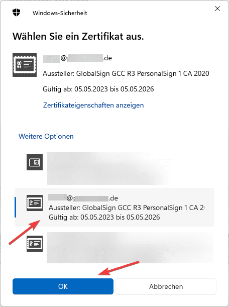 9. Anschließend müssen Sie Ihr S/MIME Zertifikat auswählen und den Button “Ok” anklicken.