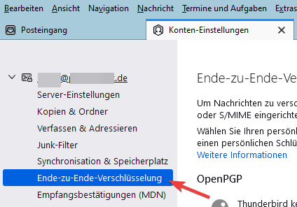 2. Rufen Sie nun bei dem betroffenen E-Mail Konto den Menüpunkt “Ende-zu-Ende-Verschlüsselung” auf.