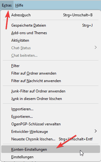 1. Rufen Sie im Thunderbird unter “Extras” die “Konten-Einstellungen” auf.