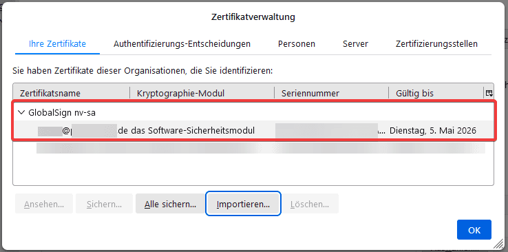 7. Sofern Sie nun Ihr S/MIME Zertifikat sehen, klicken Sie auf “Ok”.
