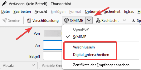 Wichtig: Die Verschlüsselung ist nur möglich, wenn der Empfänger ebenfalls ein S/MIME Zertifikat nutzt und Sie sich einmalig eine S/MIME signierte E-Mail gesendet haben.