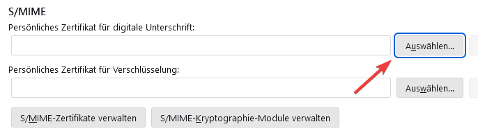 8. Damit Sie E-Mail signieren können, müssen Sie nun Ihr S/MIME Zertifikat auswählen. Klicken Sie hierzu auf “Auswählen”.