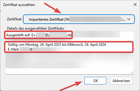 9. Wählen Sie nun Ihr S/MIME Zertifikat aus. Klicken Sie anschließend auf den Button “OK”.