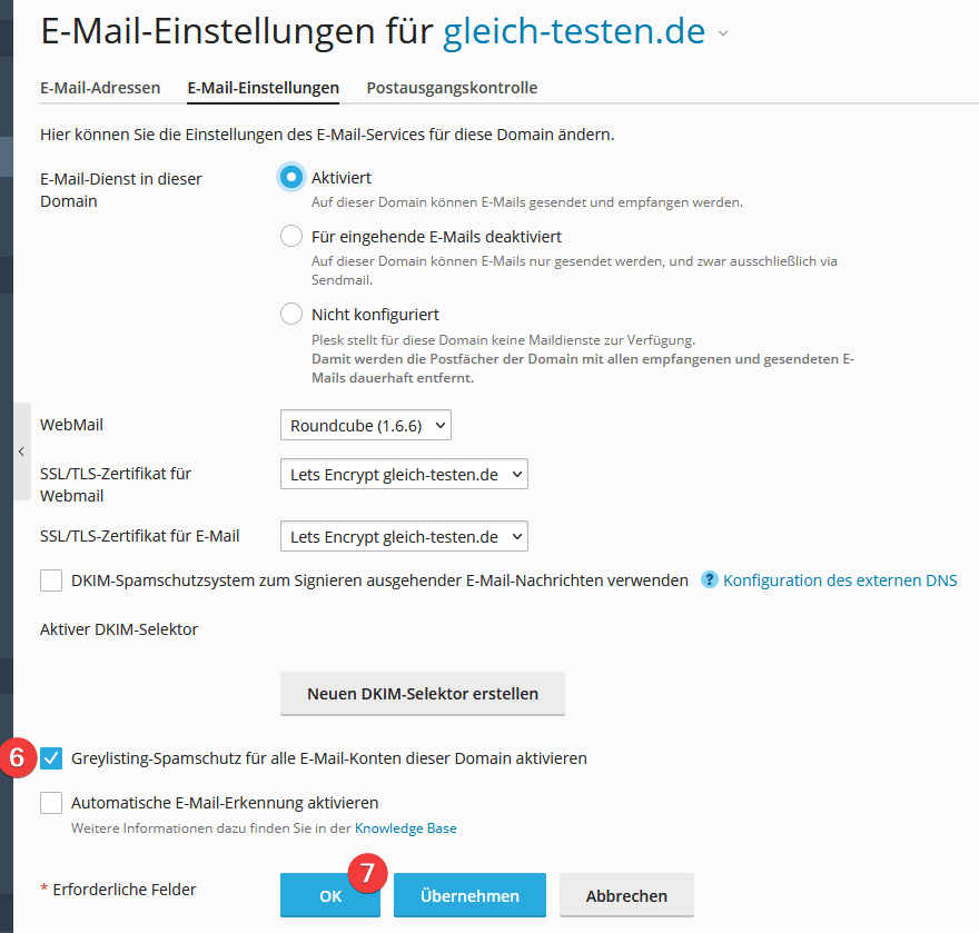 - Wählen Sie bei “Greylisting-Spamschutz für alle E-Mail-Konten dieser Domain aktivieren” (6) die gewünschte Einstellung und klicken Sie auf “OK” (7).