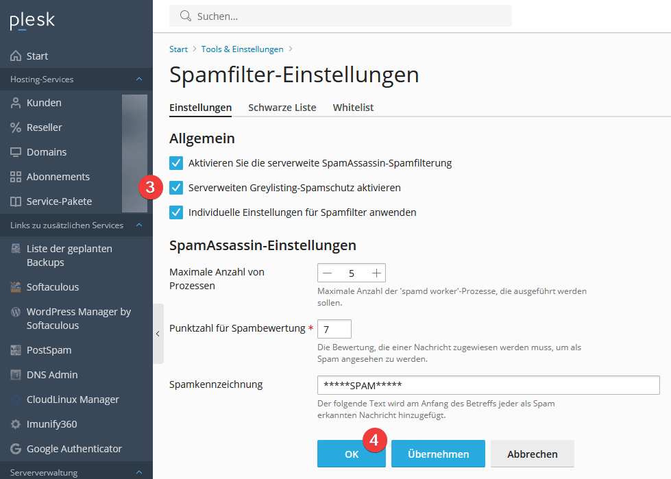 - Wählen Sie bei “Serverweiten Greylisting-Spamschutz aktivieren” (3) die gewünschte Einstellung und klicken Sie auf “OK” (4).