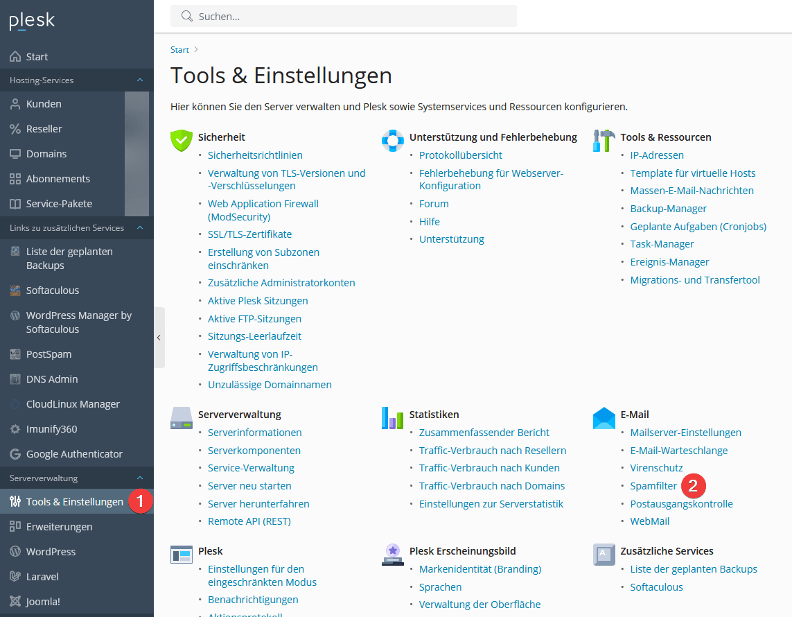 - Klicken Sie auf den Menüpunkt “Spamfilter” (2)