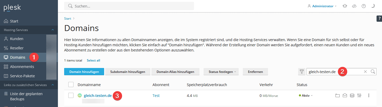 - Klicken Sie im Menü auf “Domains” (1) und suchen (2) Sie dort die gewünschte Domain und klicken diese anschließen an (3)