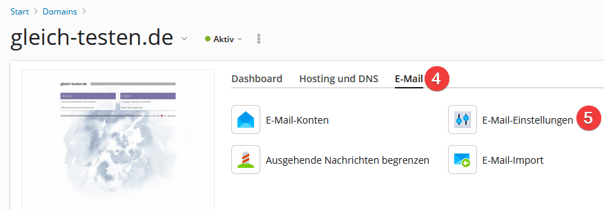 - Klicken Sie auf den Reiter “E-Mail” (4) und dann auf den Menüpunkt “E-Mail-Einstellungen” (5)