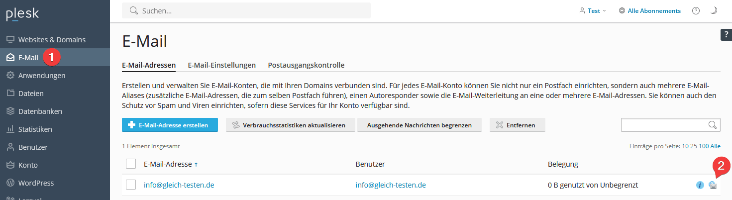 Loggen Sie sich in das Plesk Interface ein und klicken Sie links im Menü auf “E-Mail” (1). Danach klicken Sie hinter der gewünschten E-Mail Adresse auf den Globus mit dem Briefumschlag (2):