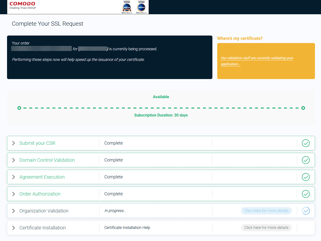 Anschließend landen Sie im Validation Manager von Sectigo. Dabei handelt es sich lediglich um eine Übersichtsseite.