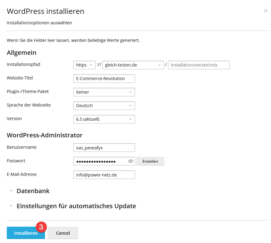 Sobald Sie auf „Installieren“ (3) geklickt haben, wird die WordPress-Instanz auf Ihrem Plesk Account installiert.