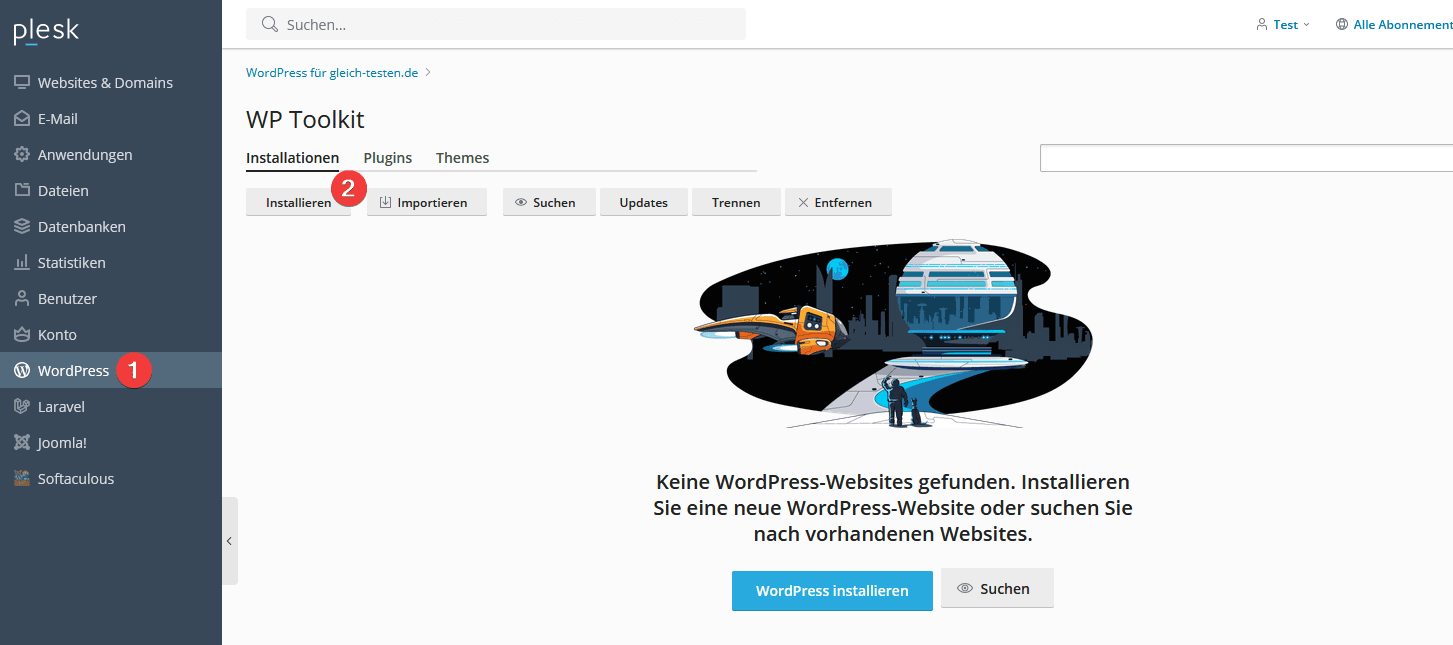Um WordPress in Plesk zu installieren, loggen Sie sich in das Plesk Interface ein und klicken Sie auf „WordPress“ (1) und danach auf „Installieren“ (2):