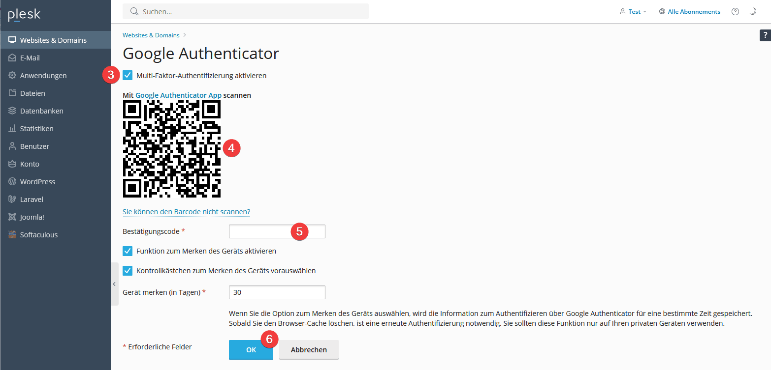 Setzen Sie nun den Haken bei „Multi-Faktor-Authentifizierung aktivieren“ (3), scannen Sie mit Ihrem Smartphone den QR-Code (4) der Ihnen angezeigt wird und geben Sie den 6-stelligen Code (5) aus dem Authenticator ein: