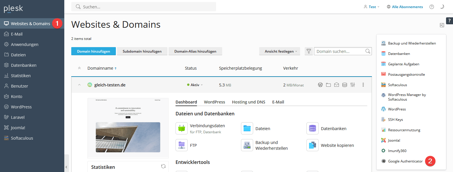 Um die 2-Faktor-Authentifizierung für Ihren Webhosting Account zu aktivieren, loggen Sie sich in das Plesk-Interface ein und klicken Sie im Menü auf “Websites & Domains” (1) und dann auf “Google Authenticator” (2):