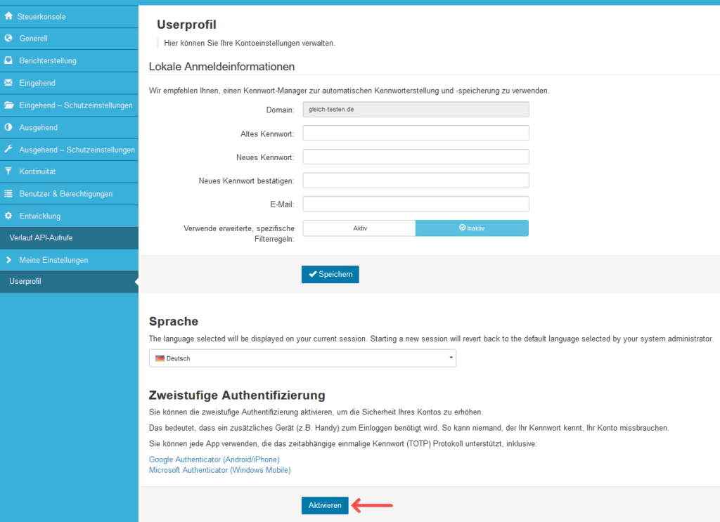 Bei unseren Spamschutz Produkten von SpamExperts können Sie die 2-Faktor-Authentifizierung in der Verwaltungsoberfläche des Spamschutzes aktivieren, indem Sie sich einloggen und auf “Userprofil” klicken: