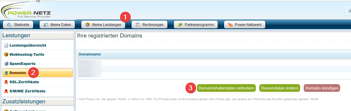 Die aktuell hinterlegten Daten können Sie im Kundenlogin unter „Meine Leistungen“ (1) -> „Domains“ (2) -> „Domaininhaberdaten anfordern“ (3) anfordern.
