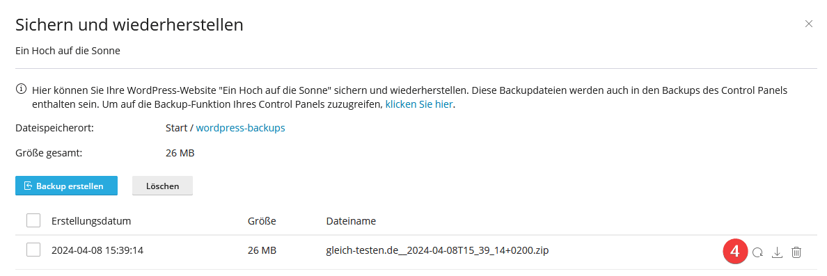 Sobald das Backup erstellt wurde, wird Ihnen dies angezeigt. Sie haben hinter jedem vorhandenen Backup die Möglichkeit eine Wiederherstellung, ein Download oder eine Löschung durchzuführen (4).