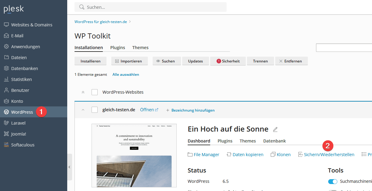 Um ein Backup Ihrer WordPress Webseite in Plesk einzurichten, klicken Sie zunächst auf “WordPress” (1) und auf “Sichern/Wiederherstellen” (2):