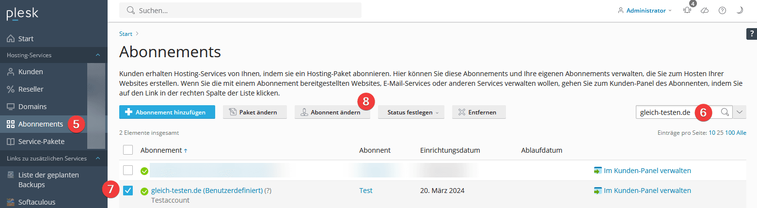 Klicken Sie auf Abonnements (5) und suchen Sie nach dem gewünschten Abonnement (6). Danach haken Sie das gewünschte Abonnement an (7) und klicken Sie auf “Abonnement ändern” (8):