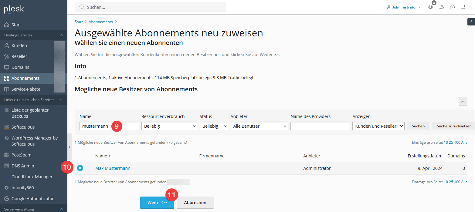 Suchen (9) Sie nach dem gewünschten Abonnenten und wählen (10) Sie diesen aus. Danach klicken Sie auf “Weiter” (11):