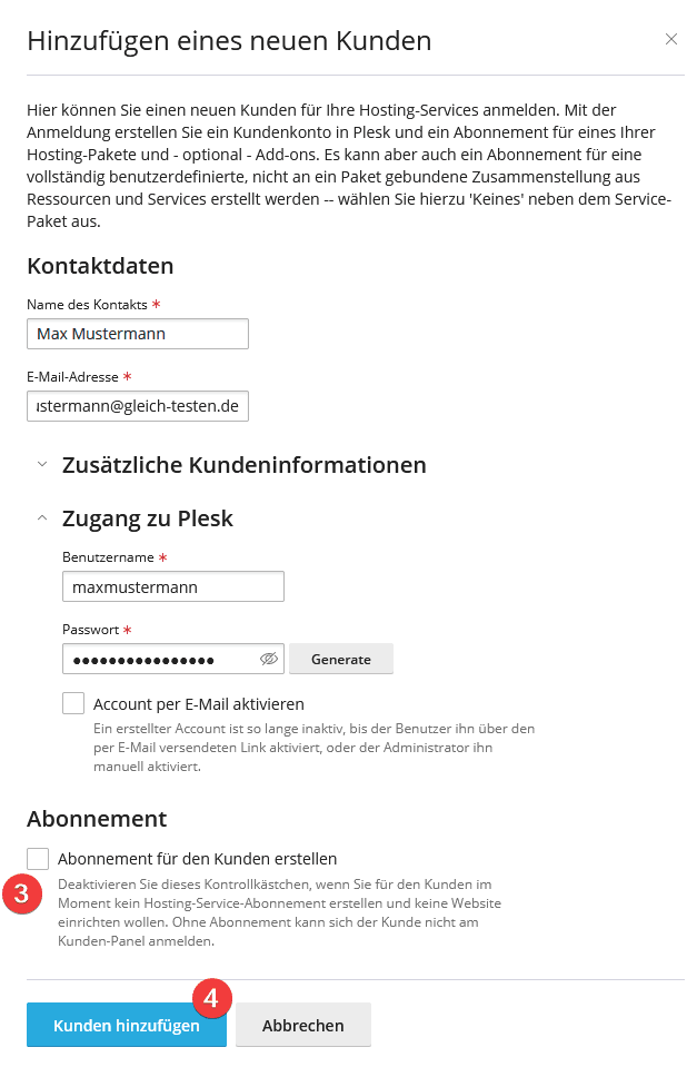 Geben Sie die entsprechenden Daten ein, entfernen Sie den Haken bei “Abonnement für den Kunden erstellen” (3) und klicken Sie auf “Kunden hinzufügen” (4):