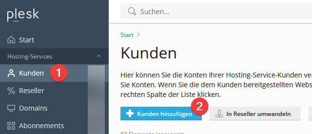 Loggen Sie sich in das Plesk Interface ein, klicken Sie auf “Kunden” (1) und “Kunden hinzufügen” (2):