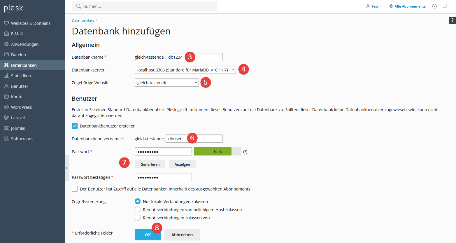 Legen Sie nun den Datenbanknamen (3) fest, wählen Sie den gewünschten Datenbankserver (4). Danach wählen Sie aus welcher Website die Datenbank (5) zugehörig ist. Sofern ein neuer Benutzer für die Datenbank angelegt werden soll, können Sie im Bereich Abschnitt “Benutzer” einen “Datenbankbenutzernamen” (6) und ein “Passwort” (7) festlegen.