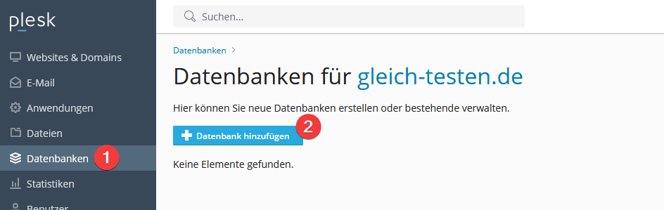 Klicken Sie links im Menü auf “Datenbanken” (1) und danach auf “Datenbank hinzufügen” (2):