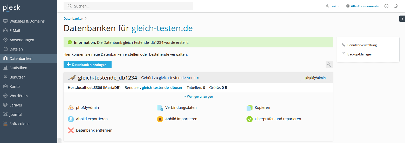 Hinweis: Bitte beachten Sie, dass bei der Installation von bestimmten Anwendungen (WordPress,…) über Plesk automatisch eine Datenbank angelegt wird.