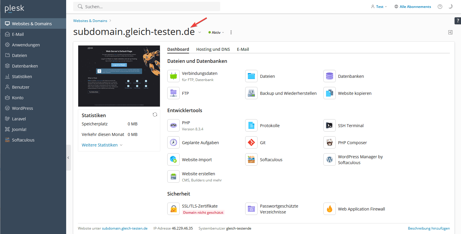 Um eine Subdomain in Plesk einzurichten, suchen Sie unter “Websites & Domains” die Domain heraus, für die eine Subdomain angelegt werden soll.