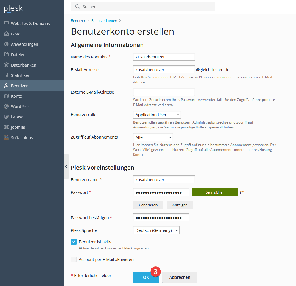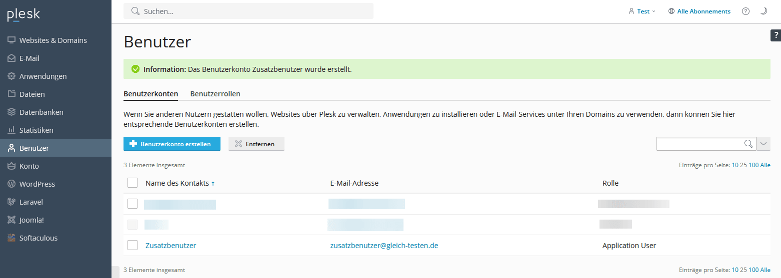 Der zusätzliche Benutzer wurde soeben angelegt. Die gewählten Zugangsdaten können nun zum Einloggen in das Plesk Interface verwendet werden.