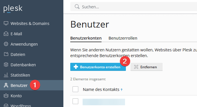Loggen Sie sich dazu zunächst in das Plesk Interface ein und klicken Sie auf Benutzer (1). Danach sehen Sie alle derzeit angelegten Benutzerkonten und deren entsprechende Benutzerrollen. Um einen neuen Benutzer anzulegen, klicken Sie auf “Benutzerkonto erstellen” (2).