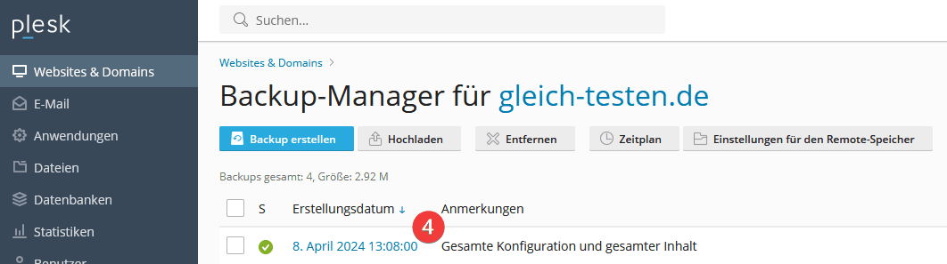 Klicken Sie nun auf das Erstellungsdatum (4) von dem Backup, welches Sie wiederherstellen wollen.