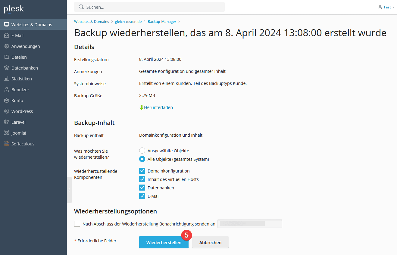 Wenn Sie beim Wiederherstellen die Benachrichtigung nach Abschluss angehakt haben, erhalten Sie eine Information per Mail, dass die Wiederherstellung des Backups abgeschlossen wurde.