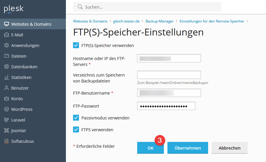 Hier geben Sie nun die Daten Ihres FTP-Users für den Backupspeicherplatz an und klicken Sie auf “OK” (3).
