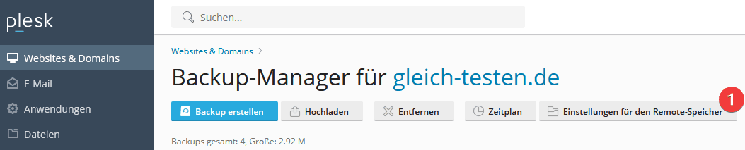 Um ein Backup in Plesk wiederherzustellen, klicken Sie zunächst auf „Websites & Domains“ (1) und unter dem Reiter „Dashboard“ (2) auf „Backup und Wiederherstellen“ (3):