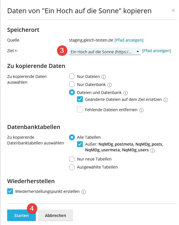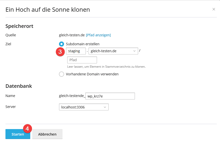 Hier wählen Sie die gewünschte Subdomain (3) für die Staging Umgebung und den Namen für die Datenbank. Sobald Sie Ihre Einstellungen getroffen haben, klicken Sie auf „Starten“ (4):