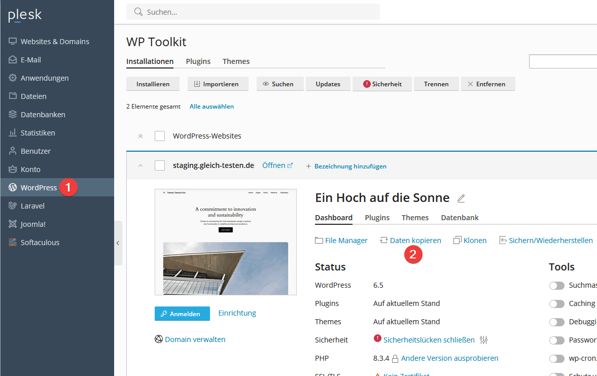 Um die Staging Umgebung auf die Live Umgebung zu übertragen, klicken Sie auf „WordPress“ (1) und dann auf „Daten kopieren“ (2):